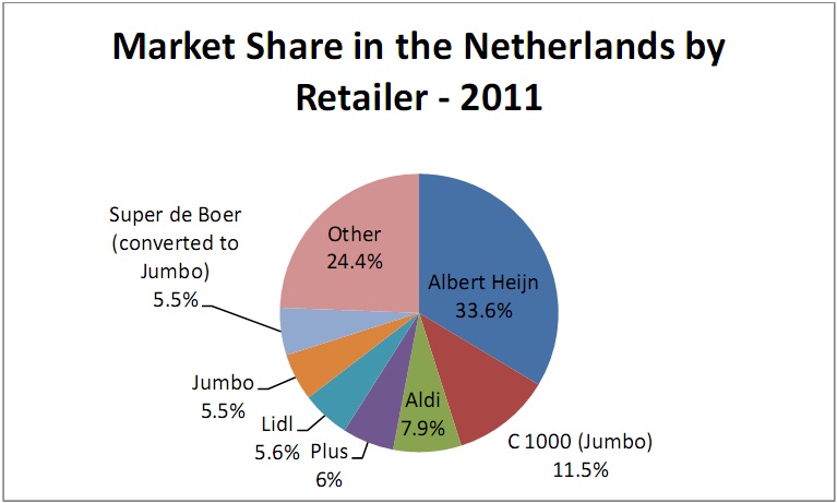 In 2012, the Dutch Fish Bureau estimated 84.9% of all fish was purchased in the “supermarket”. The Dutch retail marketplace is highly consolidated. The Dutch retail market is predominantly controlled by Alber Heijn (33.6%) and Jumbo (22.5%).