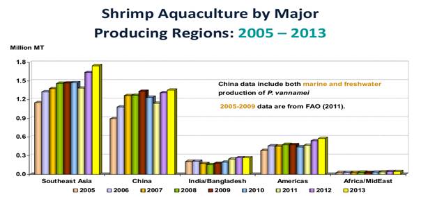 Thanks to large shrimp production, shrimp production by ASEAN dominates global shrimp supply and consumption demand. In 2013, some ASEAN shrimp industries were hit by EMS which disturbed the global shrimp market and raised shrimp price rapidly.