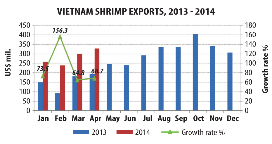 In April 2014, shrimp exports continued sharp growth of 69 percent, pushing total shrimp exports through April 2014 to US1.12 billion (up 82 percent). Whiteleg shrimp exports doubled export value of black tiger shrimp.