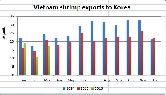 (seafood.vasep.com.vn) In QI/2016, Vietnam’s shrimp exports to South Korea reached US$47.2 million; down 8% compared to the same period of 2015. In each month of QI/2016, shrimp exports to the market in January reached the highest of over US$19 million, up 17.2% compared to Jan 2015; exports in February reached the lowest of over US$11 million, down 21.3% compared to Feb 2015; exports in March 2016 increased compared to the previous month but down 18.7% from Mar 2015.