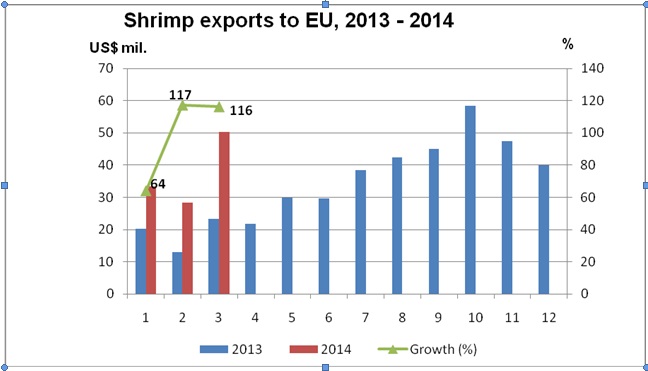 In the second half of 2013, shrimp demand from EU has been improved after more than one year of deep decline due to regional economic recession. Vietnam shrimp exports to the market in the period started to increase to US$409.47 million, up 31.3 percent year on year.