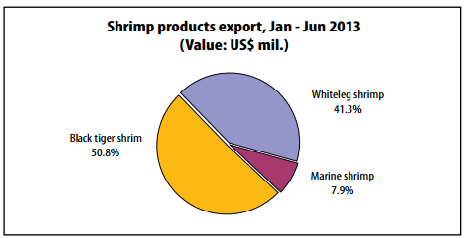 Whiteleg shrimp farming area was expanded more than black tiger shrimp farming area, resulting in a significant change in the structure of exported shrimp in Jan-Jun 2013. Whiteleg shrimp accounted for 41.3 percent of total shrimp export value while black tiger shrimp reached the 50.8 percent..bmp)