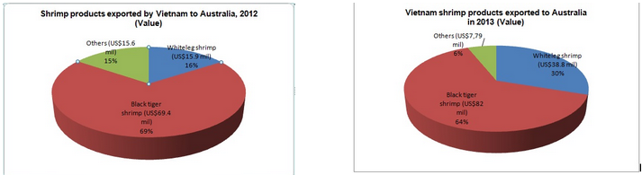 The trend of increasing imports of whiteleg shrimp over black tiger in many consumer markets such as the U.S., Japan and EU leads to the change in structure of Vietnam's shrimp products exported to global markets last year. However, Vietnam black tiger shrimp exports to Australia in 2013 remained stable with proportion of over 60 percent.