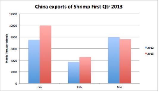 China is increasing its shrimp exports compared to 2012. For the first three months of the year through March, most months showed higher exports than the year ago period.