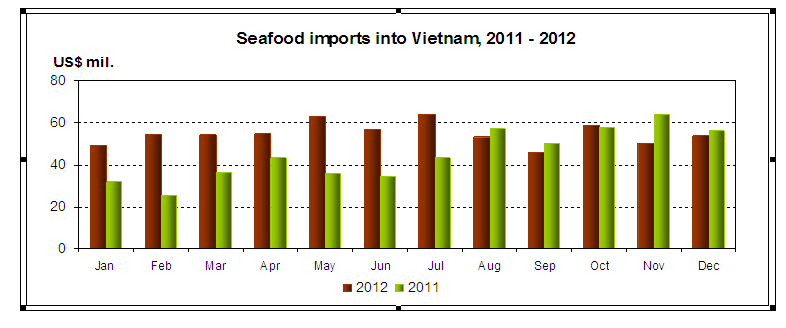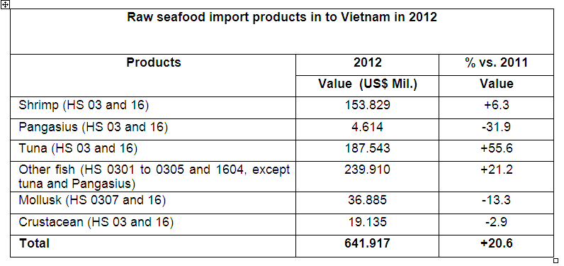 (vasep.com.vn) According to Vietnam Customs, in 2012, fish imports into Vietnam gained US$655 million, up 21 percent compared to 2011. Due to lack of domestic supply of raw material, Vietnam continued to boost imports of raw seafood processing and exporting to meet orders.