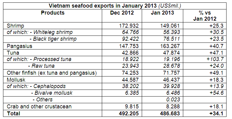 (vasep.com.vn) Vietnam seafood exports in January 2013 reached US$486.7 million, up 34.1% over the same month of 2012. Shipment to main markets recorded a double to triple digit growth with the largest growth of 111% to ASEAN. It was followed by China and Hong Kong with a rise of 97%, Brazil 89% and Australia 84.5%. Exports to others increased by 15 – 20%, except for Russia with negative growth of 40%.
