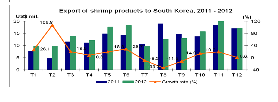 South Korea was the fifth biggest consumer market of Vietnam shrimp with a proportion of 7.7 percent in total export earnings. In 2012, shrimp exports to the country reached US$171.4 million, up 8.8 percent from that of 2011.