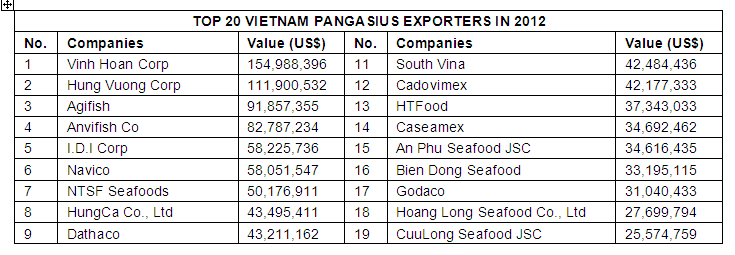 (vasep.com.vn) The number of Vietnam seafood exporters in 2012 reduced by 30% due to some main difficulties such as capital shortage for production and processing and lower demands in import markets. Among the enterprises who has suspended exports, pangasius enterprises accounted a significant proportion. Surviving enterprises are mostly ones having stable capital and strong foothold in the markets. Top 20 pangasius exporters with the export turnover of US$1.071 billion made up 61.4 percent of Vietnam’s total pangasius export value of US$1.745 billion.
