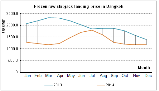 As skipjack raw material prices fell, average export price for canned tuna from Thailand to the US and EU fluctuated. After a surge in July, canned tuna exports to the US suddenly dropped as the ban on fish aggregating device (FAD) came into effect. Tuna exported to the EU experienced stable prices until the early 2014, when prices fell to the level in the US. This greatly influenced canned tuna exports of Thailand.