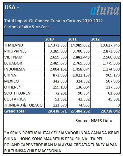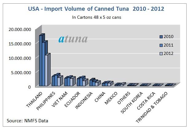 Thailand, the dominant US tuna supplier, saw its exports fall by 29% from 2011 to hit 10.6 million cartons. Philippines and Vietnam, in a distant second and third with an export volume of less than three million cartons each, also reduced their shipments by 22% and 11% respectively from 2011.