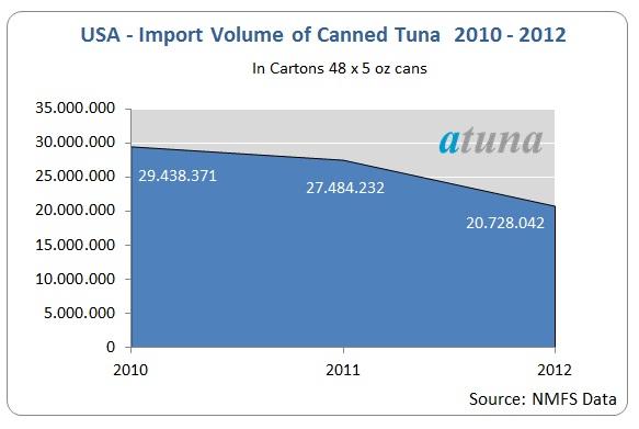 Last year, the total import volume of canned tuna crashed down to 20.7 million cartons, down 25% from 27.5 million in 2011 and 30% less than three years ago. The majority of the top 10 tuna producers who ship to the US market – including Thailand, Philippines, and Vietnam – were forced to significantly reduce their exports in 2012.