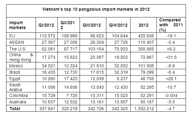 (vasep.com.vn) In 2012, Vietnam exported its pangasius to 142 nations and territories, increasing from 136 ones in 2011, reaching value of US$1.744 billion, decreasing by 3.4 percent compared to 2011.