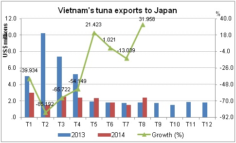Statistics of the Japan Ministry of Finance revealed that in August, tuna imports by the country increased by 16.5% in value and 32% in volume over the same period in 2013. In August only, Japan imported over 26.6 thousand MT of tuna from 51 markets, worth over US$ 176 million dollars. Among 51 markets, Vietnam is ranked 20th.