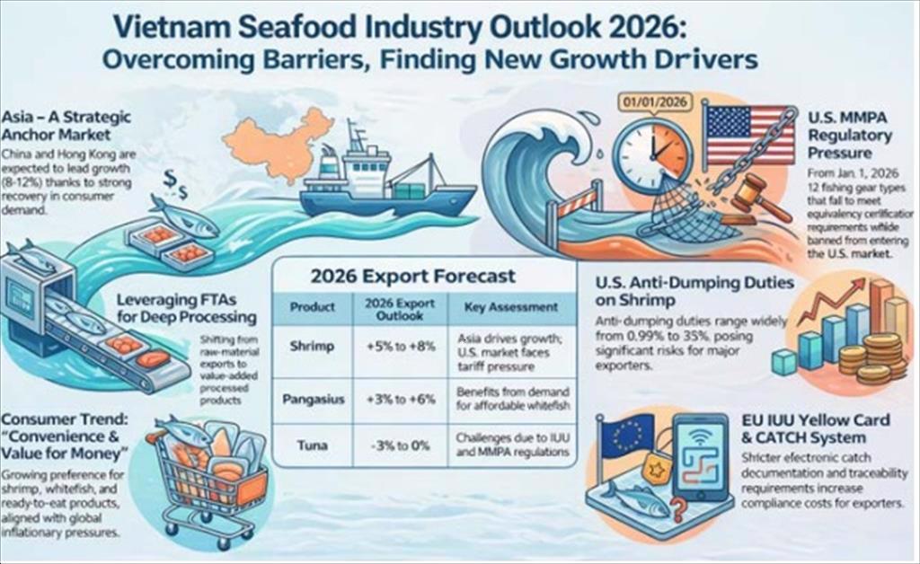 (seafood.vasep.com.vn) The year 2025 marked a pivotal milestone for Vietnam’s seafood industry in its restructuring process toward sustainability, transparency, and higher value creation, amid continued uncertainties in the global economic and trade environment. Prolonged inflation in major economies, the rising trend of trade protectionism, and increasingly stringent requirements related to environmental standards, traceability, and social responsibility have posed significant challenges to seafood production and exports. Nevertheless, overcoming these pressures, Vietnam’s seafood sector has gradually demonstrated its adaptability, maintained growth momentum, and laid an important foundation for the next stage of development.