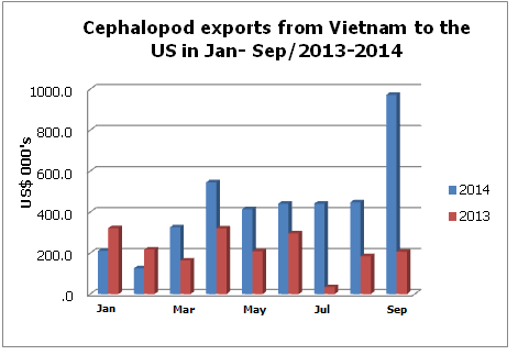 Cumulative value for cephalopod exports from Vietnam to the US for 9 months of 2014 reached US$ 2.5 million, up 30.3% year on year. The US currently is the 7th biggest cephalopod consumption market for Vietnam.