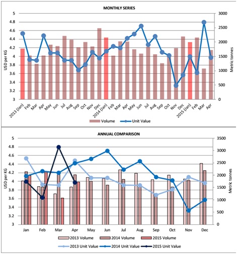 The average price of preserved/prepared clam imported by Japan in the period was at the range of US$3.6 to US$4.8 per kg.