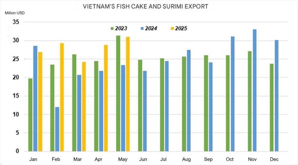 According to statistics from Vietnam Customs, exports of fish cakes and surimi in May 2025 reached their highest level since the beginning of the year, nearing USD 31 million, up 33% compared to the same period last year. This brought total export value of these products in the first five months of the year to over USD 140 million, a 32% increase year-on-year – the highest in the past three years.