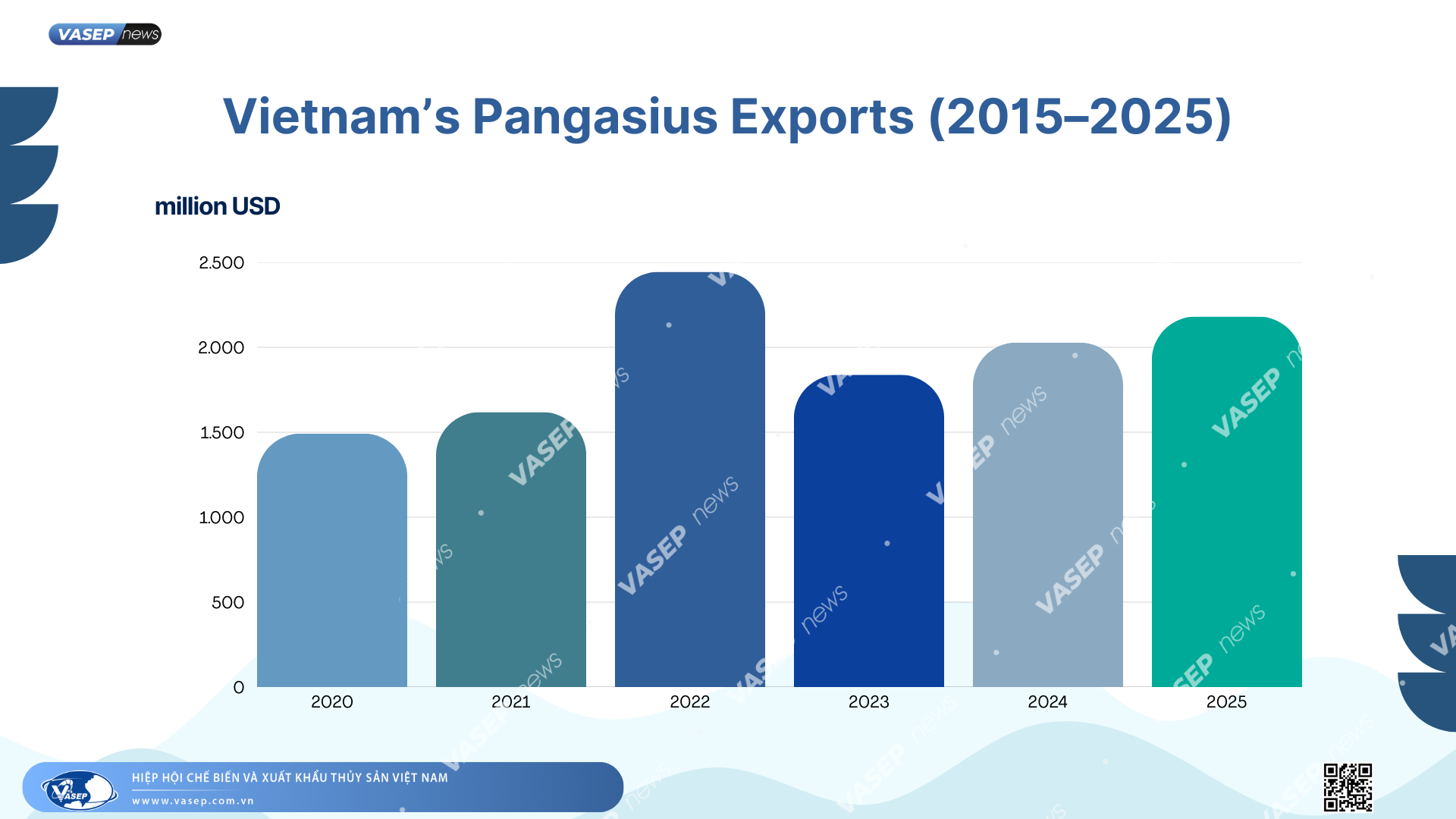 Since 2021, the proportion of pangasius in total seafood export turnover has increased again, up to 37.2% in 2022, reaching 2.4 billion USD, the highest level in the past 10 years. In 2025, pangasius export turnover reached over USD 2.2 billion, up 8% compared to 2024.