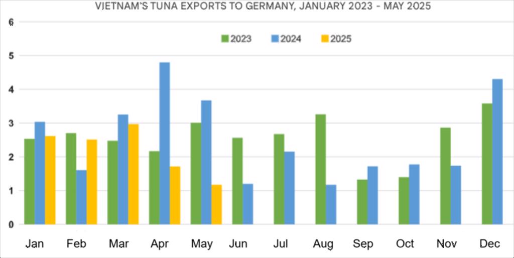 (seafood.vasep.com.vn) Exports of processed and canned tuna (HS code 16) from Vietnam to Germany have been continuously declining during the first five months of 2025, with a trend toward deeper contraction. This situation is significantly affecting Vietnam’s tuna exports to this market.