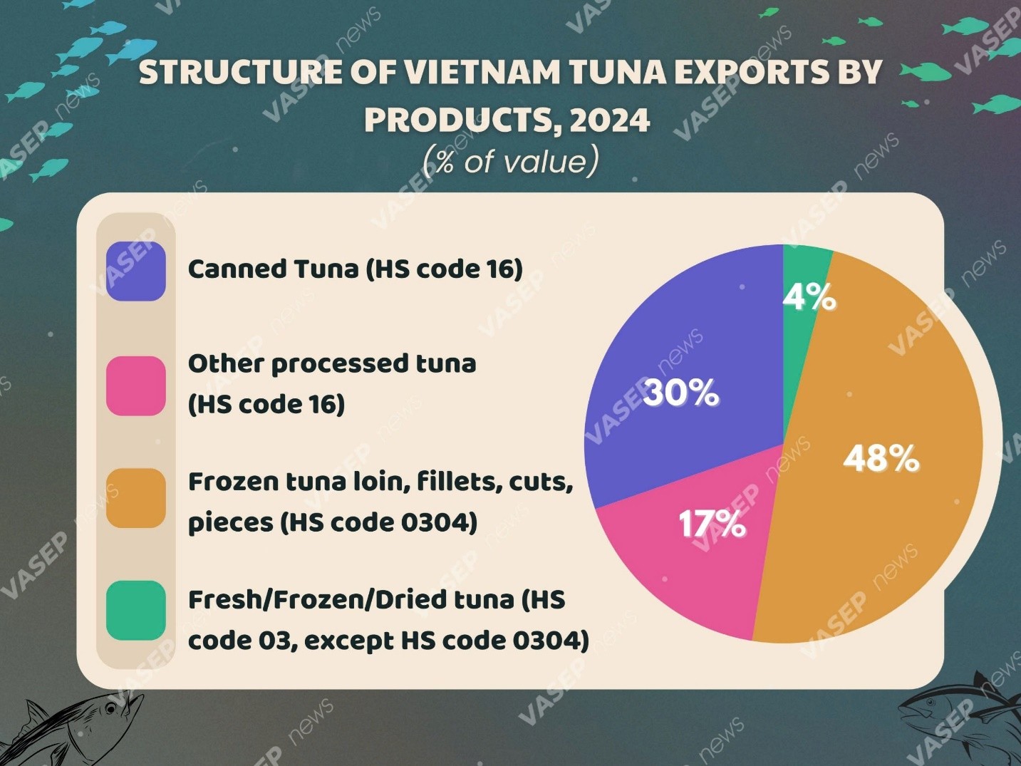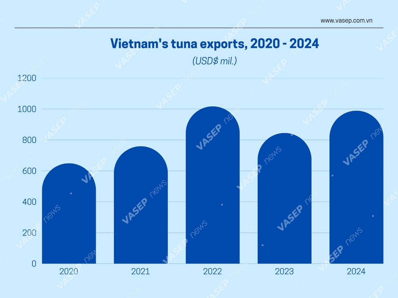 In 5 years (2020 - 2024), Vietnam's tuna export increased by 52% from 649 million USD in 2020 to 989 million USD in 2024. The average growth of Vietnam's tuna export value during this period was 8%/year. Vietnam's main tuna export species include yellowfin tuna, bigeye tuna, skipjack tuna, etc.