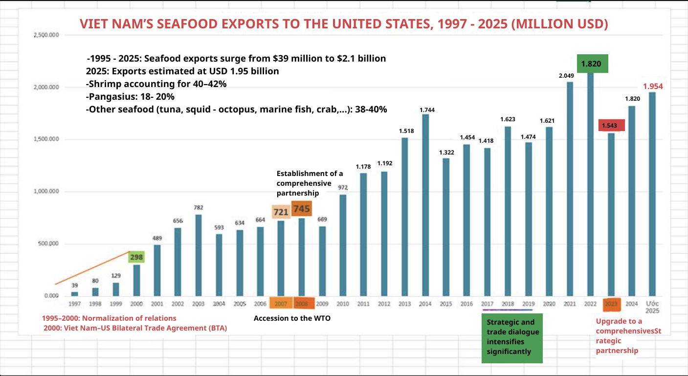 In the late 1990s, Viet Nam’s seafood exports to the United States started from a very modest scale. In 1997, export turnover stood at just $39 million, consisting mainly of frozen shrimp. The landscape, however, changed fundamentally following the signing of the Viet Nam-US Bilateral Trade Agreement (BTA) in 2000. In the same year, seafood exports to the U.S surged to nearly $300 million, ushering in a period of rapid growth that would extend for more than two decades.