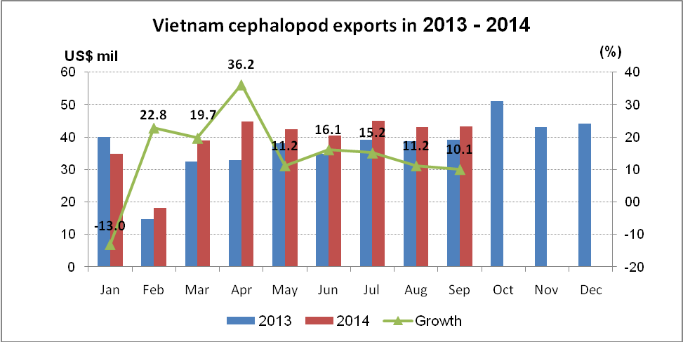 Cephalopod exports reported two-digit growth (10-36 percent) in each month of QIII/2014.