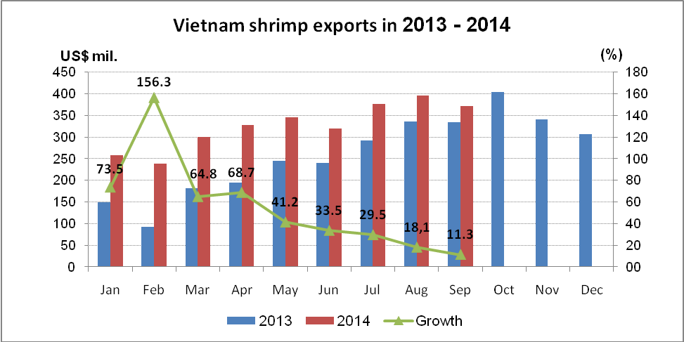 vasep.com.vn) In the first 9 months of 2014, Vietnam seafood exports hit US$5.8 billion, up 21 percent year on year. Sales in QIII/2014 were US$2.2 billion, up 15 percent.