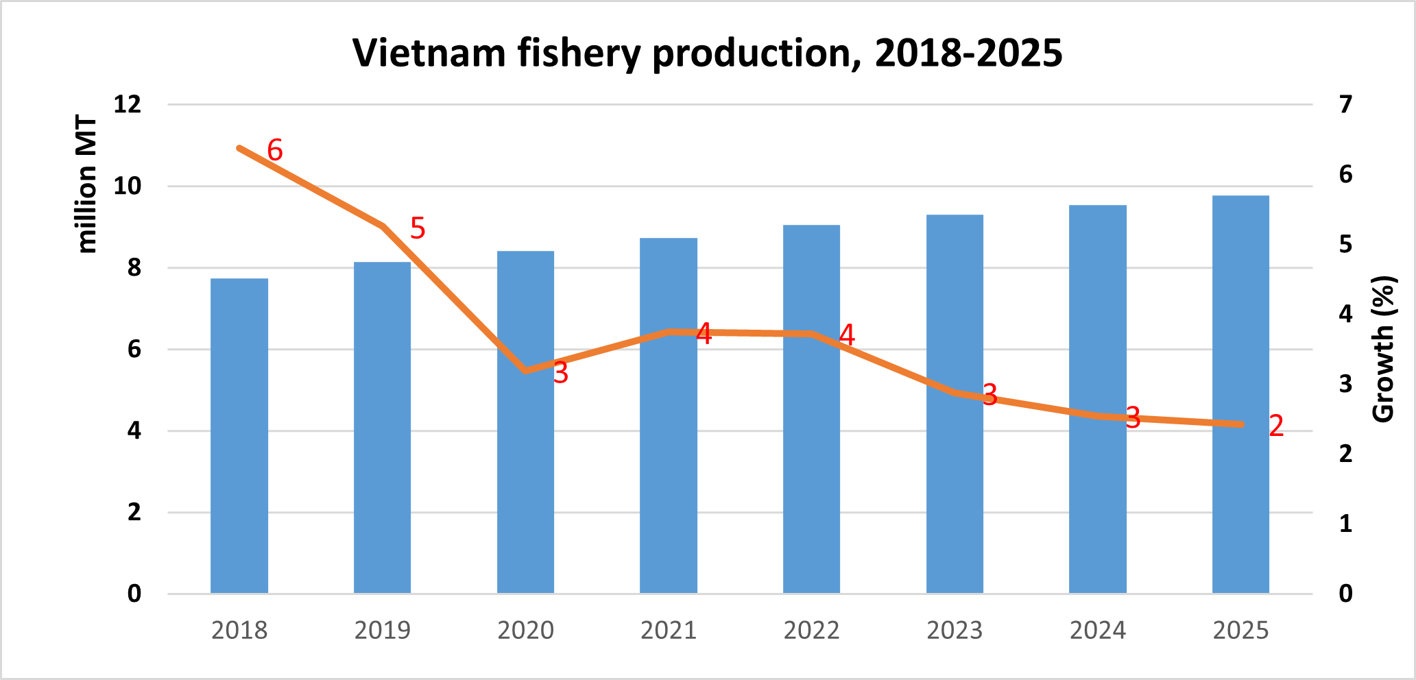 From 2018 to 2025: Vietnam's fishing output increased from 3.59 million tons to 3.80 million tons, an increase of 6%.
