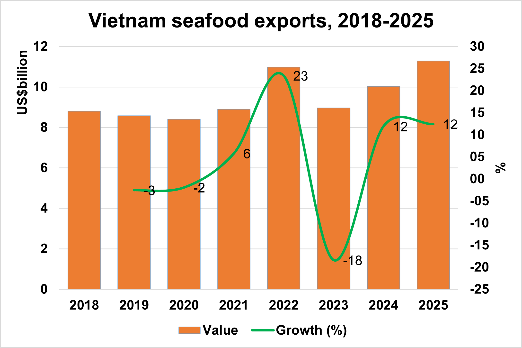 From 2018-2025: Exports increase from 8.80 billion USD in 2018 to 11.3 billion USD in 2025. Vietnam's seafood export increased continuously in past years.